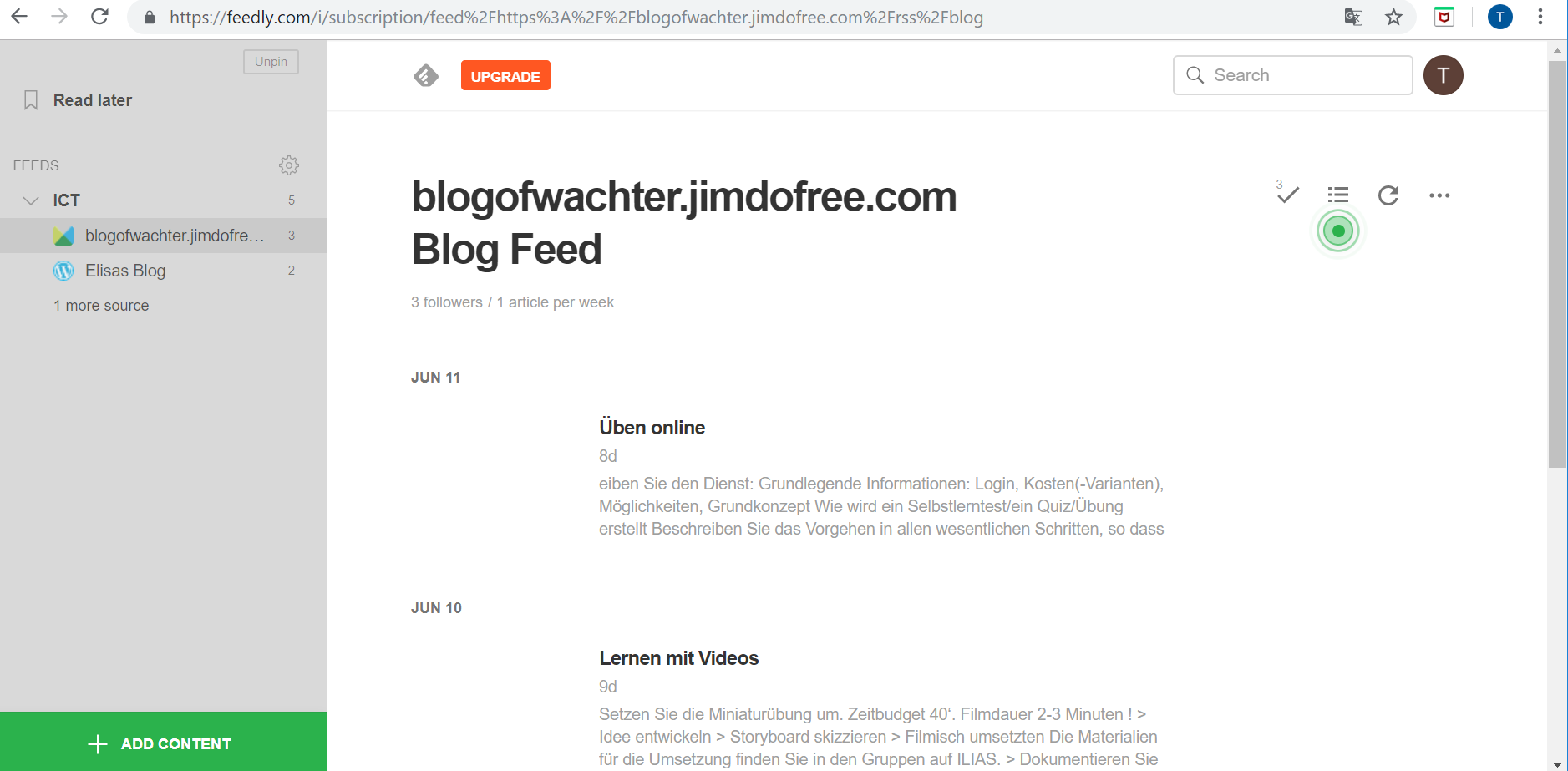Man kann hier gut erkennen, dass mein Hauptaugenmerk auf das Modul ICT liegt. Um einen neuen Feed hinzuzufügen, drückt man auf das Zahnrad bei den Feeds und dann Feed erstellen. Nun kann man alle Blogs und Links, die einem interessieren „abonnieren“ um dauerhaft auf dem Laufenden zu bleiben.